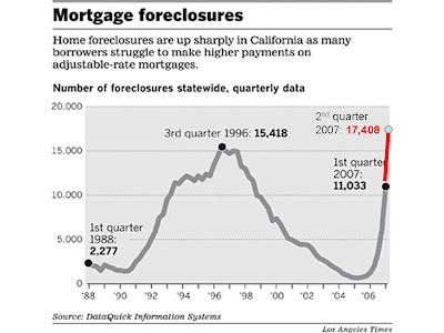 de ménages que la moyenne nationale étant concernés-, on peut constater que le rythme et l'accélération du phénomène sont très forts comparés à la courbe de la dernière crise immobilière du début des années 1990, en raison notamment du réajustement à la hausse des prêts à taux variables compte tenu des taux d'intérêts plus élevés (2nd graphe concernant uniquement la californie -données trimestrielles)